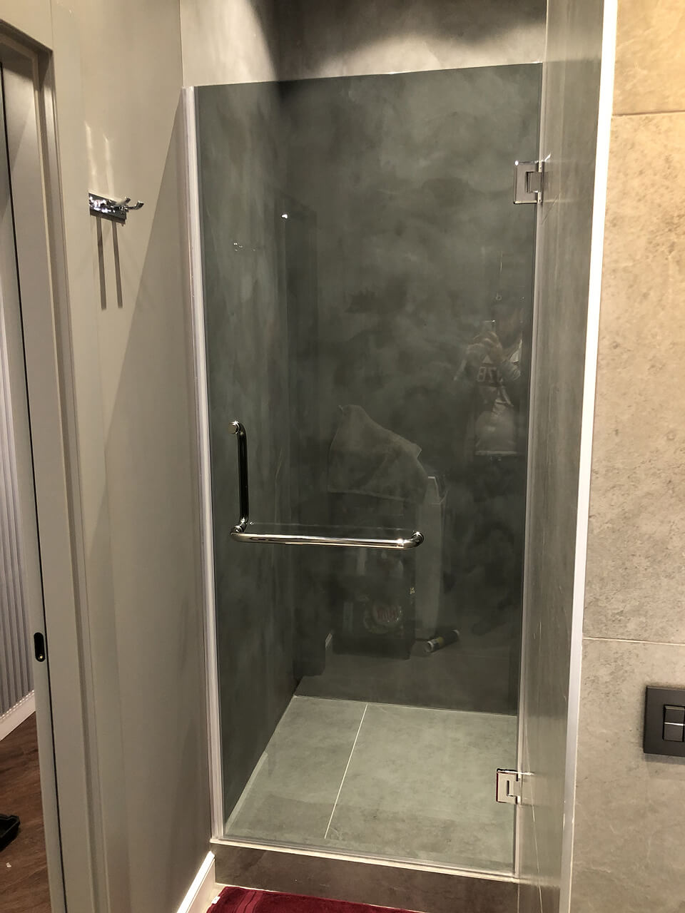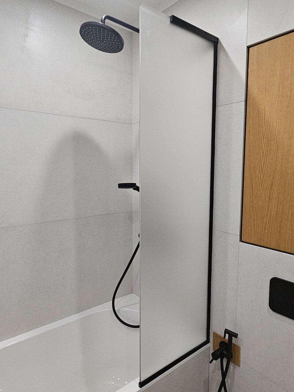 Также востребованы душевые перегородки из стекла с добором. Добор используется в случаях, когда стандартной ширины стеклянного полотна недостаточно для перекрытия проёма. Дополнительный стационарный элемент позволяет увеличить общую ширину конструкции и сохранить герметичность душевой зоны. Такие решения часто применяются в ванных комнатах с нестандартными размерами или при установке душевых перегородок без поддона.